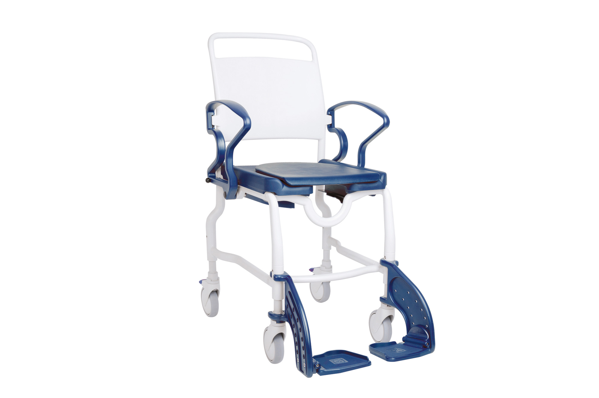 Chaise de douche et de toilettes sur roulettes pivotantes de 12,7 cm avec blocage directionnel et freins sur les roulettes postérieures.