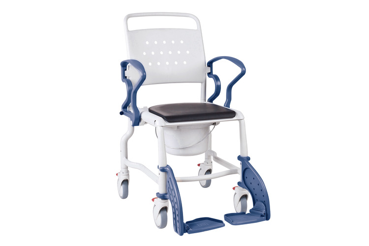 Assise percée rembourrée. Avec seau hygiénique amovible inclus. Peut être placée sur les toilettes.