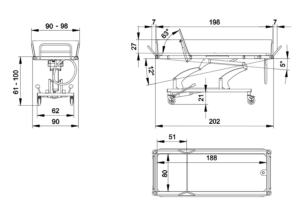 Chariot de douche et de transfert pour adultes à utiliser aussi bien dans les établissements de soins qu' à domicile. Il est possible d'adapter le chariot de douche selon les préférences du personnel soignant ou des membres de la famille et des caractéristiques anthropométriques du patient. Il peut prendre la position de Trendelenburg, en plus de l'inclinaison du plateau pour le drainage de l'eau. Il est équipé de barrières pivotantes incorporées dans la structure du plateau.