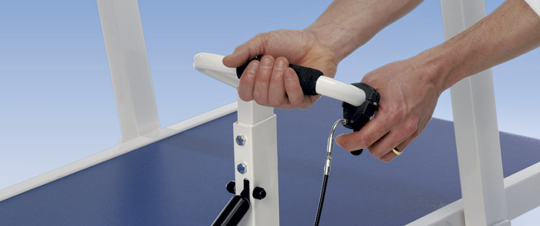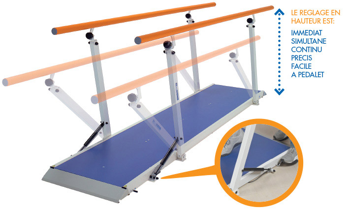 La commande à pédale actionne des vérins à gaz pour un déplacement continu assurant un maximum de précision et d’uniformité dans le réglage. Le réglage peut être effectué rapidement même pendant l’exécution d’un exercice de rééducation. La main courante est réglable aussi en largeur.