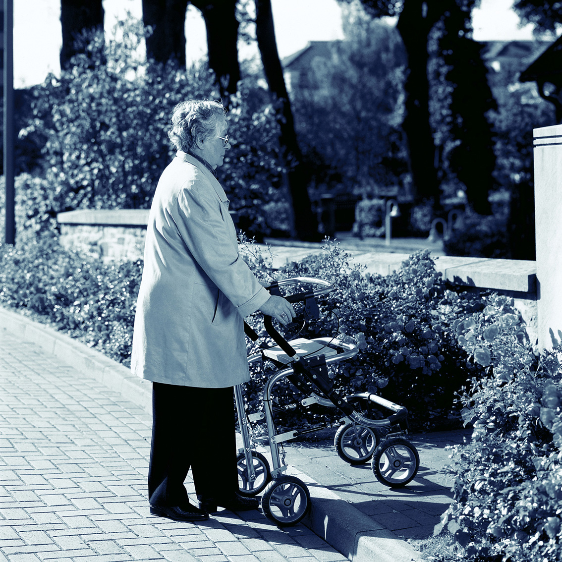 Déambulateur en aluminium pliant et réglable, avec quatre roues dont deux roues avec frein et deux pivotantes.