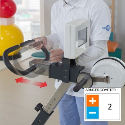 Le bras-ergomètre peut être réglé en profondeur, avec une portée totale de 12,5 cm en 6 étapes. Cet ajustement ergonomique donne plus de flexibilité à l'utilisateur selon le mouvement prévu qui doit être fait avec les membres supérieurs. De plus, lors des séances d'entraînement des jambes, le bras-ergomètre peut être complètement poussé vers l'arrière pour ne pas gêner le mouvement.