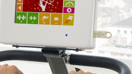 Le jeu lié à la vitesse de pédalage montre une balade dans une rue de la ville. Selon la vitesse du pédalage, la conduite devient plus rapide ou plus lente.