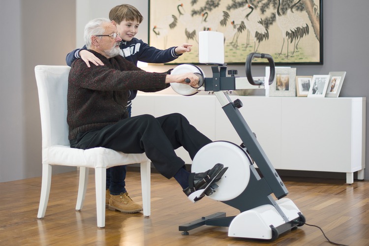 C’est un vélo ergomètre pour la thérapie du mouvement des membres supérieurs et inférieurs. Ce modèle complet pour les jambes et les bras, se caractérise donc, aussi par un bras-ergomètre équipé d’un deuxième moteur séparé pour le mouvement des membres supérieurs. Ceci permet d’effectuer un exercice de pédalage avec les membres inférieurs ou supérieurs en position assise semi-allongée. Il est possible pour le patient d’y accéder en restant assis dans son propre fauteuil roulant. Dans ce modèle complet pour les jambes et les bras, le chassîs soutient aussi le bras-ergomètre avec son moteur et la poignée ainsi que le moteur pour l’exercice des membres inférieurs. Le chassîs intègre aussi l’ordinateur à écran tactile d’où il est possible de gérer toutes les fonctions et la grande poignée qui sert de support et pour le transport. Lors des exercices des membres supérieurs, si il n’y a aucune activité motrice résiduelle, le MotoLife ® assure un mouvement de pédalage passif des bras. Quand le patient est capable de pédaler, même faiblement avec ses propres muscles, le moteur fournit une assistance pour commencer et maintenir le mouvement à la vitesse choisie (mouvement assisté). Si le patient est en mesure de dépasser la vitesse du moteur et de maintenir le pédalage de manière autonome, le MotoLife ® peut opposer au mouvement une résistance réglable destinée à augmenter le travail musculaire et l’efficacité cardio-respiratoire (kinésithérapie active).
