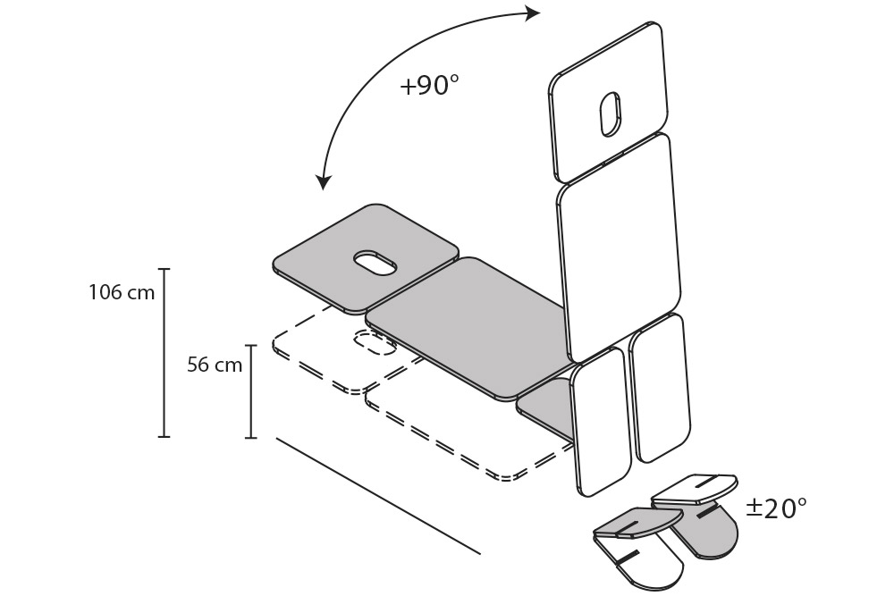 Table de verticalisation à quatre sections avec un système d'inclinaison électrique alimenté par une batterie rechargeable 24V. Chargeur pour batterie de série. La charge maximale garantie est de 140 kg, plan inclinable jusqu'à 90°et hauteur de la table réglable de 56 à 106 cm au moyen d'une commande manuelle. Le degré d'inclinaison de la table se mesure grâce à un indicateur intégré. La section de tête est réglable proclive/déclive par vérin à gaz.
