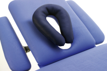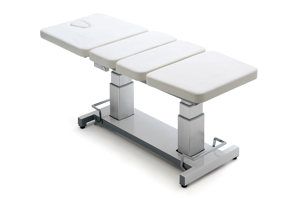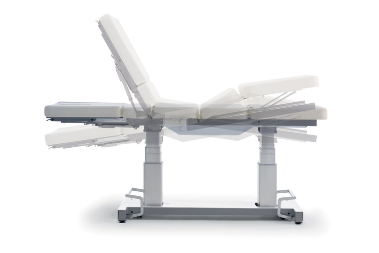 Table avec dossier à section unique et réglage par vérin à gaz. Plateau à 3 sections réglables par commande à gaz.