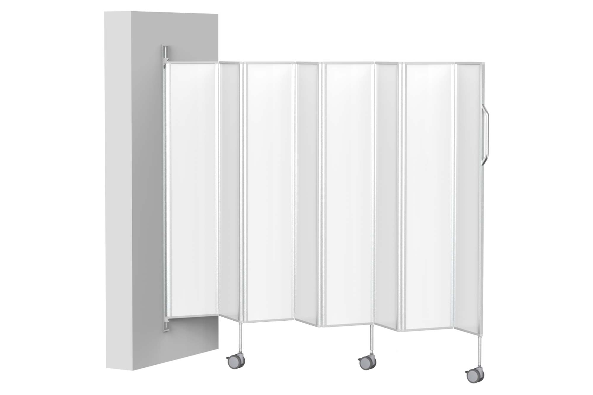 Paravent en contreplaqué composé de 8 panneaux pliables à fixer au mur au moyen d'un rail.