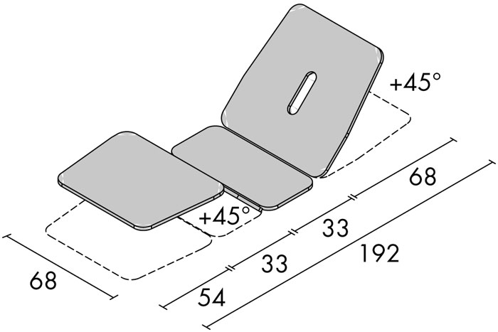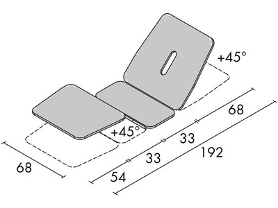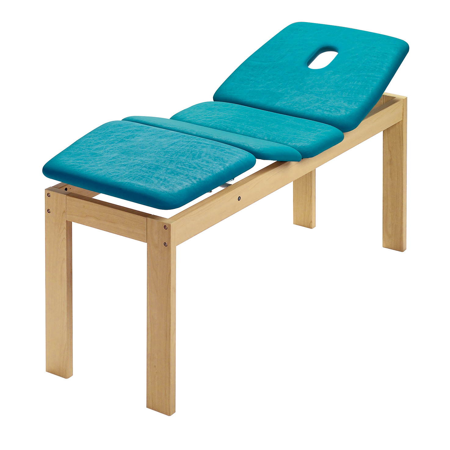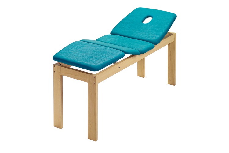 Table d'examen et de traitement en hêtre à quatre sections et hauteur fixe 78 cm. Les sections ont une largeur standard de 68 cm et les sections mobiles sont réglables manuellement. Ce modèle prévoit un dossier avec trou nez-bouche. Possibilité de commander séparément un bouchon pour le trou nez-bouche.